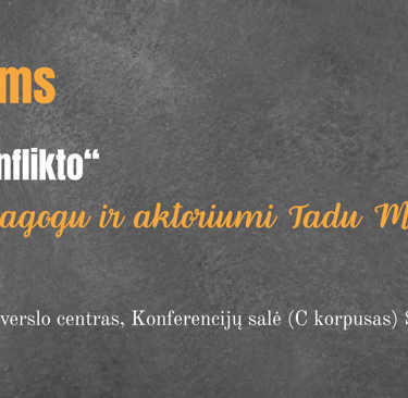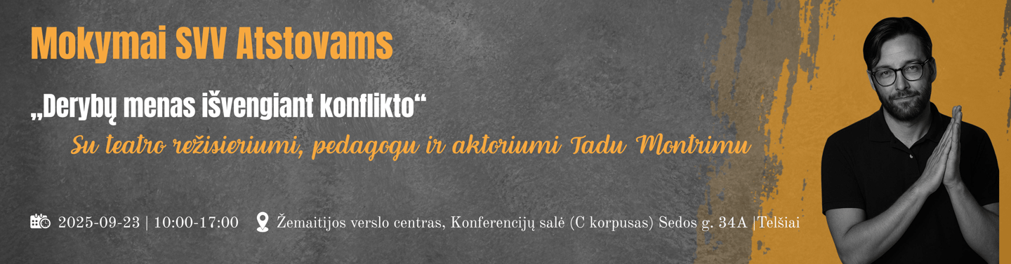 Kviečiame smulkaus ir vidutinio verslo atstovus į mokymus „Derybų menas išvengiant konflikto“ su teatro ir renginių režisieriumi, aktoriumi bei treneriu Tadu Montrimu. Mokymų dalyviams bus dovanojama knyga „Jokių kompromisų!“, kuri taps įžanga į mokymus ir verslo sėkmę.